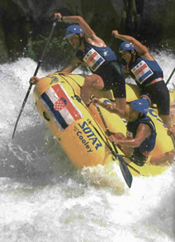 Opracowanie Željka Kelemena Rafting? Tak proszę! Niema młodego menadżera i biznesmena który nie jest nerwowy i zestresowany codzienną pracą , który nie chce twierdząco odpowiedzieć na pytanie o rafting. Niema a dlaczego miał by być. Łatwo przywołać w wyobraźni moment spływu pontonem np. w dól rzeki „Dobra” błogi smak przygody a później „małe piwko” (dobrze dwa piwka...)A ekstremalny rafting ? To już zupełnie coś innego. Wody są tutaj dzikie, fale duże i bardzo niebezpiecznie. Nie ma większego wyzwania niż udział w zawodach CAMEL WHISE WATER CHALLENGE. Porównajmy to tak żeby było jasne: to co oznacza Camel Trophy dla automobilistów, tym jest Camel Challenge dla fanów raftingu. Najbardziej zatwardziali „amatorzy pontonów” w ostatnich 3 latach walczyli przeciwko profesjonalistą z całego świata. Po afrykańskim Zambezi, dolnego biegu Rio Reventazo w pralasach Kostaryki, rzeką Futalefu w Chile...ta ostatnia nazywana w żargonie podróżnkow jako FU jest uważana za najlepszą rzeką na świecie dla zwolenników raftingu. Camel Challenge przyciąga już od lat zwolenników ekstremalnego raftigu z całego świata. Może nie uwierzycie ale w tym elitarnym bractwie nie chodzi tylko o podniesienie adrenaliny ale też o szaloną zabawę na „brzegu” w miłej atmosferze. W Afryce na przykład tańczą w rytmie tam-tamów, w Kostaryce w rytmie salsy a w Chile jest organizowany prawdziwy karnawał. Kiedy tłum bawiących się osiąga stan „wrzenia” wszyscy obecni starym „raftingowym” obyczajem nawzajem się wpychają w ubraniach do basenu czy to tancerz, barman, dyskdżokej czy tez VIP. Nie, to nie jest koniec zabawy tylko jej „mokra” część. Rafterzy są tak naprawdę „mokrymi włóczęgami” a większość uczestników która przyjeżdża na Camel Challenge są profesjonalnymi przewodnikami i sternikami (skiperami). Ich praca polega na tym żeby turysta żądny wrażeń i przygód który za to płaci został dobrze wstrząśnięty, zmoczony, przestraszony (trochę ale nie za bardzo..), cała zabawa polega na tym aby bezpiecznie dopłynąć w dół rzeki. Jedni robią to tylko dla pieniędzy , drudzy dla przyjemności a trzeci mają to we krwi i rafting jest ich sposobem na życie. Zasady są proste im niebezpieczniej tym lepiej, gorączkę adrenaliny można wywołać na wszystkich kontynentach: przy brzegach Colorado, na Alasce, w Ekwadorze ,Nepalu, Nowej Zelandii lub na Syberii. Tak jak lato przechodzi przez Ekwador tak oni jadą za nim. Jeśli poznasz prawdziwego przewodnika rzecznego-profesjonalistę który z tego żyje, możesz oczekiwać że za swoje pieniądze przeżyjesz prawdziwą przygodę. Jak rozpoznać profesjonalistę: jest wysoki, muskularny i opalony słońcem . Już się czujecie bezpieczni, czyż nie , chociaż miękną wam kolana gdy płyniecie w dół rzeki. Jak jest ubrany ?. Ubrany jest w szorty i koszulkę, na nogach ma sandały na głowie czapkę „bejzbolówkę”. To naprawdę znaczy iż w tym chłodnym z pozoru profesjonaliście siedzi w środku wesołek i zawadiaka który gdy nic wam nie grozi i pozwoli sytuacja, lubi pożartować i doprowadzić was do łez ze śmiechu swoimi opowieściami. Tyle o pierwszym wrażeniu, a co nosi w podręcznym worku: sznurek do rzucania , kask i kamizelka ratunkowa przy której ma ostry nóż i gwizdek, parę karabińczyków, flip-line. Jak ponton jest na wodach rzeki On jest kapitanem i jedynym autorytetem. Na końcu wypłyniecie z Nim z jakiegoś kanionu mokrzy jak mysz, zmęczeni ale zadowoleni jak po dobrej zakrapianej imprezie. No z tą zakrapianą imprezą to nie tak dosłownie. U celu dobry „rafting” zawsze kończył by się dobrą zabawa na brzegu, a zatwardziali skiperzy potrafią opowiadać anegdoty o barach takich jak Explorersa przy wodospadach Wiktorii w Afryce, gdzie się pije lokalne piwa Hunter’s i Sambuca Black (Idziemy na Zimbabuańskie ?) kiedy z szafy grającej grzmi hard-rock . Kiedy piwko zrobi swoje wtedy się tańczy i śpiewa w każdym kącie, za barem lub na stołach, a później niektóre dziewczyny z ekipy robią nawet striptiz. Menadżerowie i księgowe, vip-y, modelki, bogacze, studentki i cała reszta która się znajduje u podnóży wodospadów Wiktorii zachowuje się jakby doświadczyli „przygody swojego życia”. Po najbardziej zwariowanym raftingu na świecie mogą uczestniczyć w zwariowanym rafting’s party. Jak myślicie kto jest główną gwiazdą w oczach rafting-turystek? Oczywiście skiperzy, a kto inny. Czy jest dziwne że z ciężkim sercem rezygnują ze swojego sposobu życia? Co na to mówią damy ? „Oni są jak dzieci”- mówi Lisa Valdemarca- „a ich życie jest jedną wielką zabawą”. A jak pewnego dnia dorosną i odchodzą to już nigdy nie wracają. Lisa była kiedyś menadżerem w Nouvelles Frontieres jednej z większych agencji które organizują rafting na Zambezi. Skończywszy z dobrym wynikiem kurs przewodnika – raftingu, opuściła spokojną pracę za biurkiem w agencji aby dnie spędzać na rzece. W zeszłym roku pracowała w Chorwacji i wymieniała doświadczenia ze skiperami na rzece Dobrej. „Niema dziewczyny w Vic Falls, która by utrzymała poważny związek” mówi „ skiperzy są świetnymi chłopakami i turystki ich uwielbiają, biegają za Nimi jak wariatki. Konkurencja jest ogromna. Dlatego jesteśmy tylko przyjaciółmi i tylko przyjaźń wchodzi w rachubę.” Rafting nie jest bez tradycji w Chorwacji. Spławiało się kiedyś rzeką Savą ze Slovenji węgiel i sprzedawało w Zagrzebiu i budulec drzewny który po dziś dzień podpiera dachy w Zagrzebiu. Od ówczesnej kupieckiej faktorii-bazy noclegowej niedaleko Zagrzebia , powstał ośrodek wycieczkowy „Suhnia” w miejscowości Podsusjed, gdzie zdobią ściany stare zdjęcia powodzi, spławów i skutej lodem rzeki Savy. Z rozwojem komercyjnego raftingu powstał Zagrebaćki Rafting Klub, który służył w czasie wojny domowej